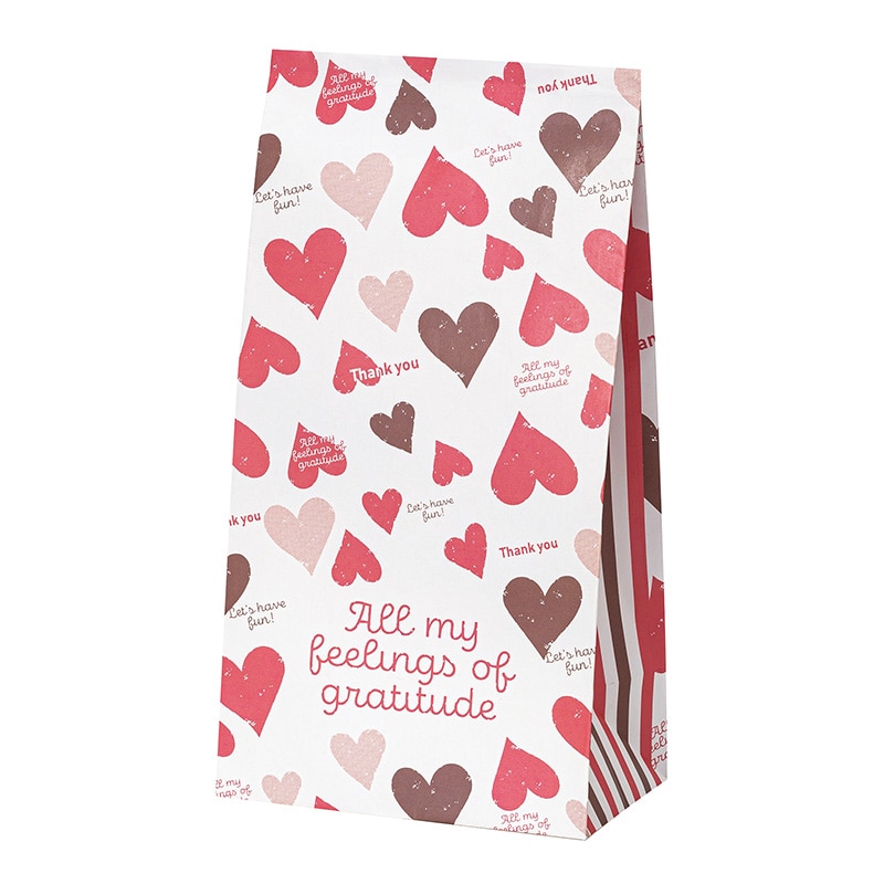 ● 柔らかな色合いのハートが降り注ぐデザインの角底袋です。