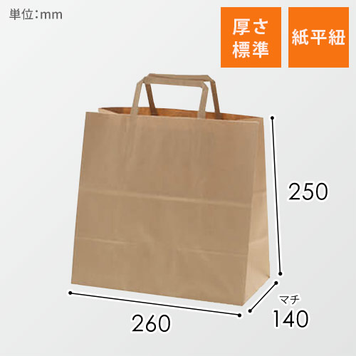 プレーンな手提げ紙袋です。サイズは食パン2斤を入れるのに適したサイズです。無地のデザインで、さまざまな用途にご利用いただけます。持ち手には平紐を採用しており、未使用時には紐が飛び出ていないため、在庫スペースを節約できます。