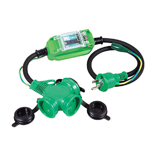 ●危険な漏電事故を未然に防ぐ防雨型のブレーカー付三ッ口コンセントです。●コンセントは防雨キャップ付15Aアース付125V×3個です。●ポッキンプラグです。●電線種はVCT2.0mm[[の2乗]]です。●雨天の野外。●大手工場・化学工場・発電所・プラント設備・建設工事。