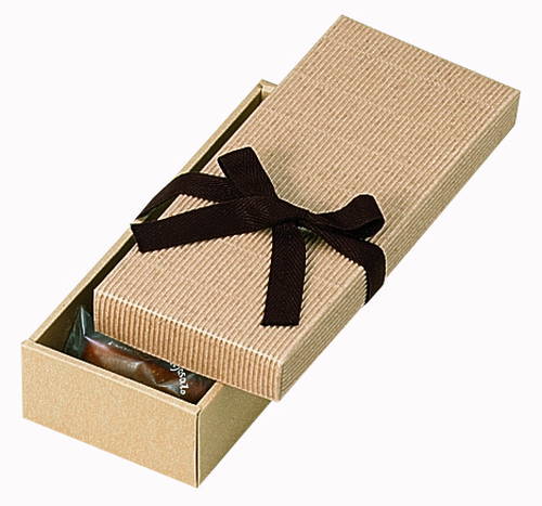サイズが275×110×60mmで高級感あるかぶせ蓋タイプのギフトパッケージ。材質はE/F(1.5mm厚)のダンボールで、表面の色は茶(クラフト)です。お菓子や雑貨などのラッピング・商品パッケージにいかがでしょうか。 茶色のリボン(紐)付き。包装紙なしでも魅力あるBOXです。付属のリボン(紐)を結ぶだけで簡単包装。