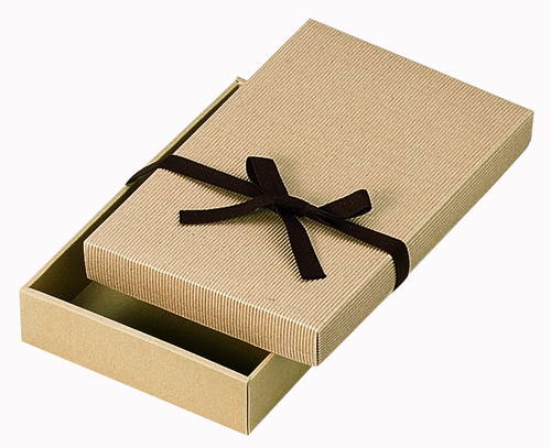 サイズが340×220×60mmのギフトパッケージ。高級感あるかぶせ蓋タイプのC式。材質はE/F(1.5mm厚)のダンボールで、表面の色は茶(クラフト)です。茶色のリボン(平紐)付きで、包装紙無しでもお使いいただける仕様です。お菓子や雑貨などのラッピング・商品パッケージにいかがでしょうか。