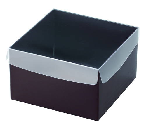 サイズが125×125×75mmで高級感あるかぶせ蓋タイプのギフトパッケージ。材質は主に厚紙で、本体の色はブラウン(英字柄)・フタは透明です。お菓子などのラッピング・商品パッケージにいかがでしょうか。 箱の側面はUVニス柄で、マットベースに英字はグロスで表現。見る角度で印象が変わります。