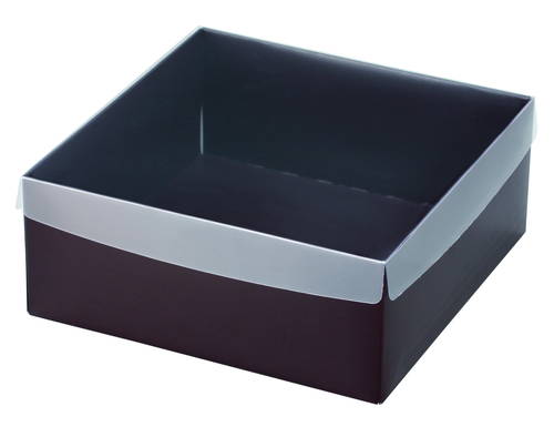 サイズが185×185×75mmで高級感あるかぶせ蓋タイプの中身が見えるギフトパッケージ。