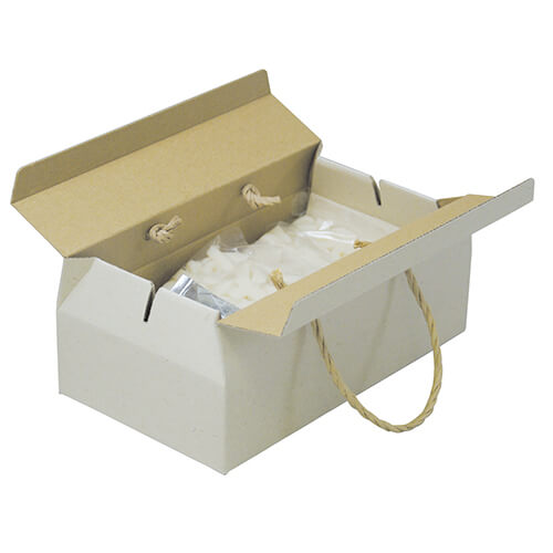 手提げ紐の付いたギフトボックス(Lサイズ)。表面はテクスチャ感のある白色で、ナチュラルな印象です。和菓子や焼き菓子などのお持ち帰りギフトにいかがでしょうか。