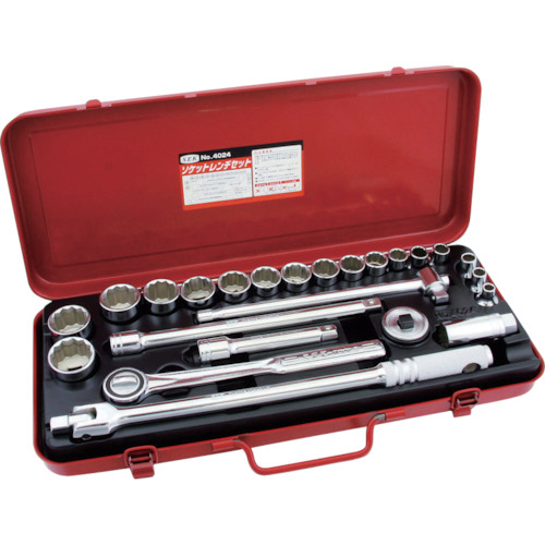 ●ソケットセット内容(mm):8・10・11・12・13・14・17・19・21・22・23・24・26・27・29・30・32、ラチェットハンドル(mm):250、フレックスハンドル(mm):380、スライディングTハンドル(mm):250、エクステンションバー(mm):125・250、スパークプラグソケット(mm):21