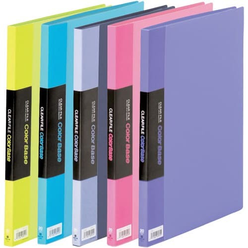 キングジムのクリアーファイルの定番「カラーベース」。表紙と同系色の中紙付き。不透明表紙、中紙ありタイプ。背とポケットが溶着されている固定式です。
