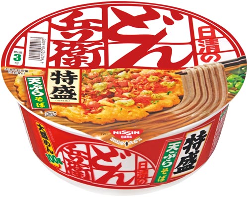 【西日本風】どん兵衛ならではのまっすぐですすり心地の良いそばに、鰹と昆布ダシの効いた旨みあるつゆがよく合う、大判のあとのせサクサク天ぷらがおいしい特盛天ぷらそば。