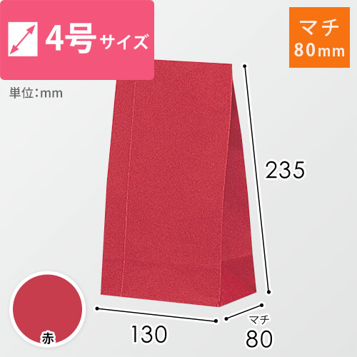 マチが付いて容量たっぷりな角底袋。クラフト紙に印刷を施すことで、深みのある赤色に仕上がりました。