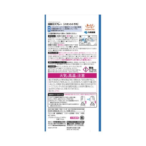 イオンパワーとワイド噴射で悪臭を瞬間消臭するトイレ用消臭スプレー。除菌効果でいつも清潔に保てる。持ちやすい細身の缶サイズ。