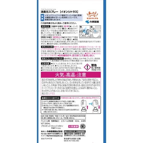 イオンパワーとワイド噴射で悪臭を瞬間消臭するトイレ用消臭スプレー。除菌効果でいつも清潔に保てる。持ちやすい細身の缶サイズ。