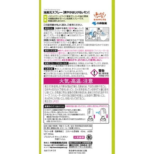 イオンパワーとワイド噴射で悪臭を瞬間消臭するトイレ用消臭スプレー。除菌効果でいつも清潔に保てる。持ちやすい細身の缶サイズ。