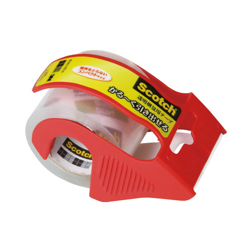 軽く引き出せる梱包テープ。テープを引き出す時の音も低減。引き出しにも入るコンパクトな小巻タイプ。カッターディスペンサー付。お得な3個セット。