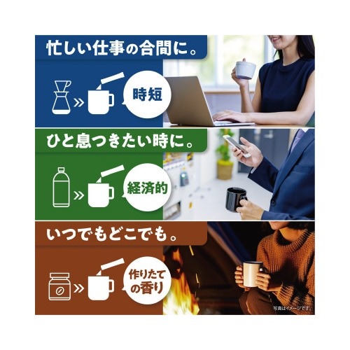 まろやかで豊かなコクと香り。冷たい水や牛乳にもサッと溶けるので、ホットはもちろん簡単にアイスコーヒーが作れます。お好みでスティックシュガーやスティックミルクと一緒にオフィスでお楽しみください。大容量。