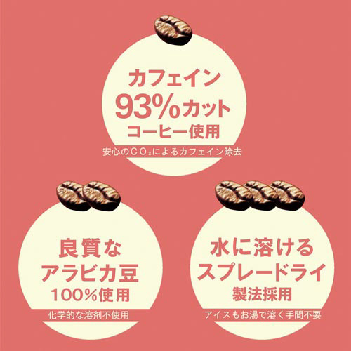 カフェイン93%カットコーヒー使用。ブレンディならではの冷たい水にもおいしく溶けるカフェインレスインスタントコーヒー。お好みでスティックシュガーやコーヒーミルクと一緒にオフィスでお楽しみください。