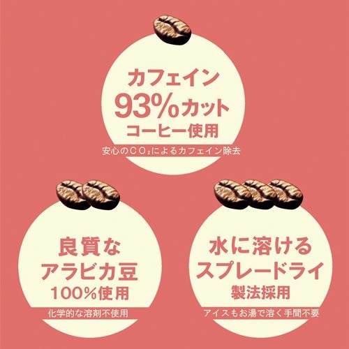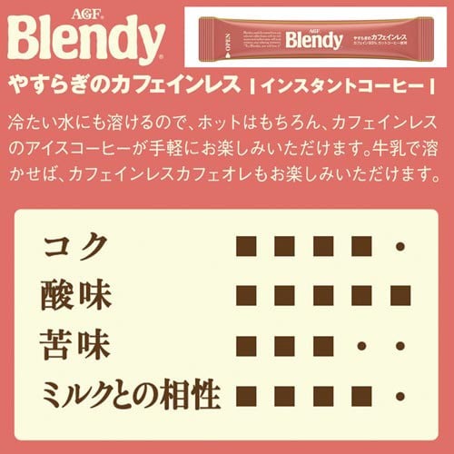 カフェイン93%カットコーヒー使用。ブレンディならではの冷たい水にもおいしく溶けるカフェインレスインスタントコーヒー。お好みでスティックシュガーやコーヒーミルクと一緒にオフィスでお楽しみください。