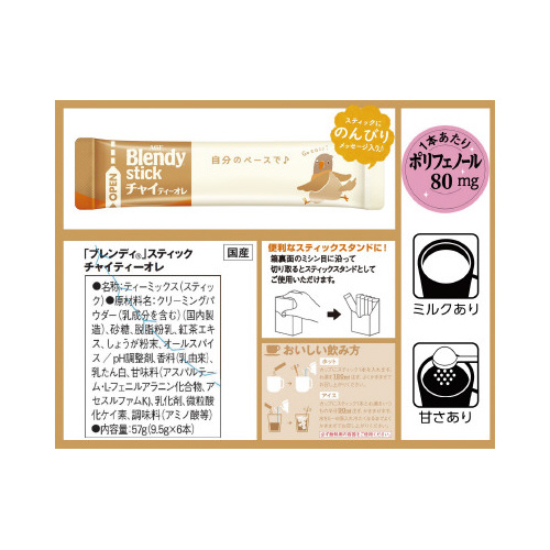 ジンジャーとシナモンの香り、ミルクのコクとスパイスがまろやかに溶け合った風味豊かなチャイティーです。1杯1杯がいつも新鮮な個包装スティックタイプ。