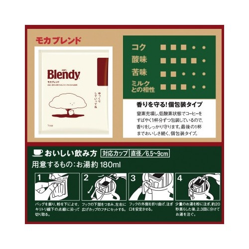 豊かな香りと、雑味のないクリアなコクが最後のひとくちまで続く、マグカップでお楽しみいただけるドリップコーヒーです。モカ豆の特徴を活かた、甘い香りと、やわらかな後味。オフィスに最適なお得用大容量サイズ。