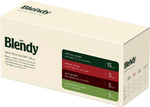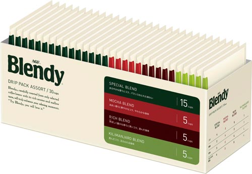 スペシャルブレンド、キリマンジャロブレンド、モカブレンド、リッチブレンドの4種類の味わいが楽しめる、ブレンディドリップパックのアソートタイプです。