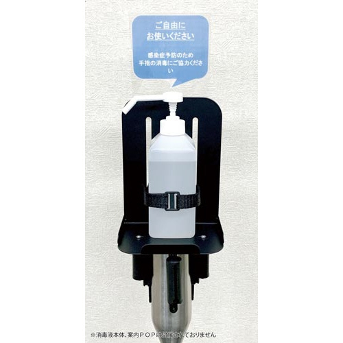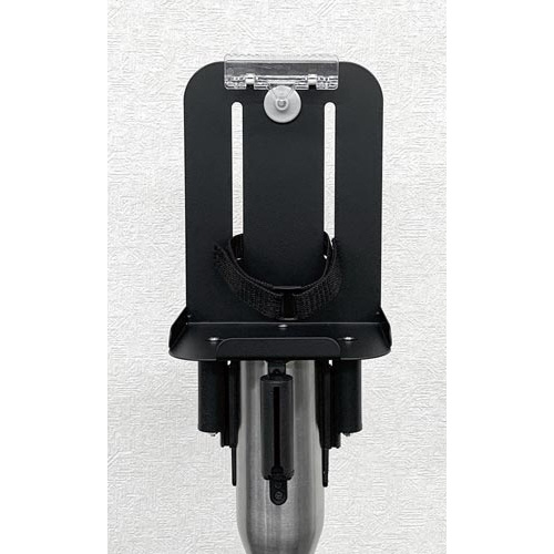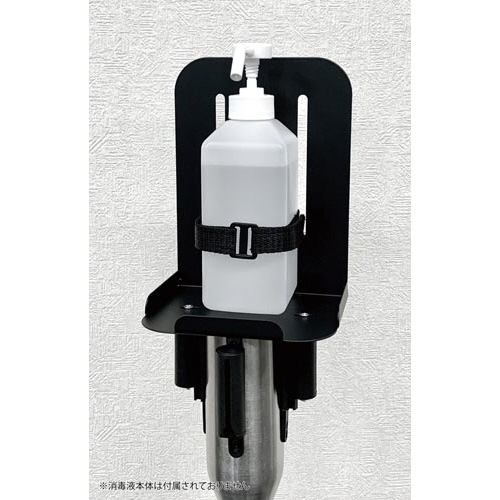 スリムガイドポールに取り付け可能な消毒液台。ベルトを引き出した状態で台の設置が可能です。