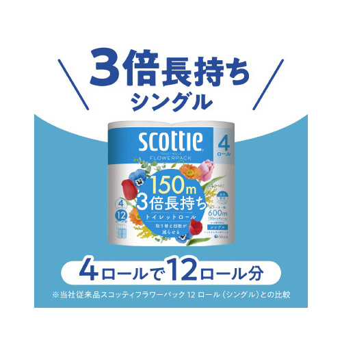 4ロールで12ロール分の長さ(※当社製品比)のトイレットペーパー。1ロールで3ロール分だから、取り替えの手間が減り、収納スペースも1/3に収まります。家庭用ホルダー適応サイズ。くつろぎの花の香り付き。