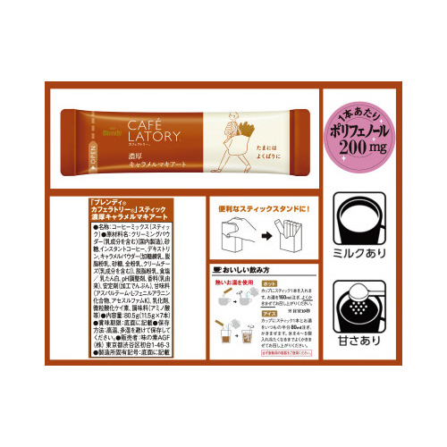 高品質な人気のスティックシリーズ。甘く香ばしいキャラメルが濃厚ミルクに溶け込んだ、こだわりのキャラメルマキアートです。スティックコーヒーにお湯を淹れた瞬間に泡立つ、本格的な味わいをお楽しみください。