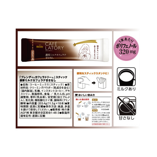 高品質な人気のスティックシリーズ。コク深いコーヒーと濃厚ミルクのバランスにこだわった、ノンシュガーのカフェラテです。スティックコーヒーにお湯を入れた瞬間に泡立つ、本格的な味わいをお楽しみください。