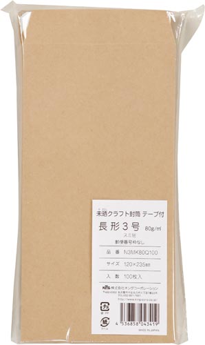 未晒クラフト封筒 長3 テープ付き 100枚入
