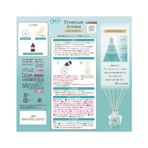 パフューマーが厳選したフレグランスオイルを配合した香水調の香りがスティックから広がります。当社液体タイプ※と比べフレグランスオイルを5倍濃密配合※お部屋の消臭力PremiumAroma400mL