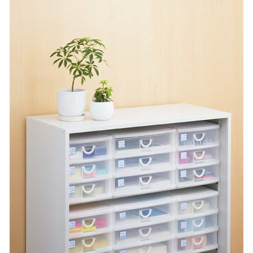 A4用紙サイズで浅型3段の横型引き出しケース。書類などの整理に最適!横型なので奥行きのない場所や作業スペースを有効活用!エルピスA4横型専用トレーを追加すれば提出書類や回覧書類などの一時保管にも便利!