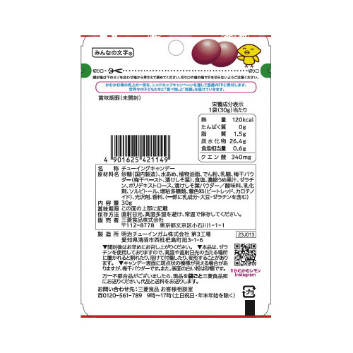 紀州産南高梅使用。クエン酸配合。すっきりとした甘酸っぱい味が特徴です。ソフトコーティング、外生地、内生地の3層構造の楕円型。1袋30gで約17粒入り。しそ風味の「梅」商品です。