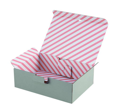 材質はE/F(1.5mm厚)のダンボールで、表面の色はグレーで内側がサーモンピンクのストライプ柄です。