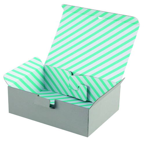 材質はE/F(1.5mm厚)のダンボールで、表面の色はグレー・内側はミントブルーのストライプ柄です。