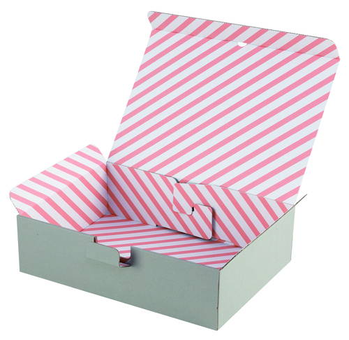 材質はE/F(1.5mm厚)のダンボールで、表面の色はグレーで内側がサーモンピンクのストライプ柄です。