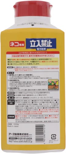 用途以外に使用しない。体調のすぐれない時は使用しない。かぶれやすい人は使用しない。子供やペットの触れる所に置かない。シミ、変色の原因となるので自動車、門扉、シャッター、その他の塗装面や大理石、金属、プラスチックなどにはかからないよう注意する。薬剤がかかった場合は直ちに洗い落とす。効果の持続期間は天候や温度条件により異なることがある。ニオイに対して鈍くなっている猫や空腹、発情期の猫には効果が劣る場合がある。このような場合にはニオイによる忌避以外の対策が必要。