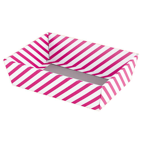 鮮やかな赤(マゼンタ)のストライプ柄がおしゃれな紙製トレー。雑貨やお菓子のギフトにピッタリな大きさです。パッケージやディスプレイ、ラッピングなどにいかがでしょうか。