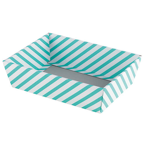 さわやかなミントブルーのストライプ柄がおしゃれな紙製トレー。雑貨やお菓子のギフトにピッタリな大きさです。パッケージやディスプレイ、ラッピングなどにいかがでしょうか。