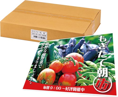 ラミフリーは紙を特殊フィルムで貼り合わせた優れた耐水紙です。これまでラミネートしていたプライスカードやPOPなどの各種ツールをプリントするだけで作成でき、時間短縮等の作業効率が大幅に向上します。