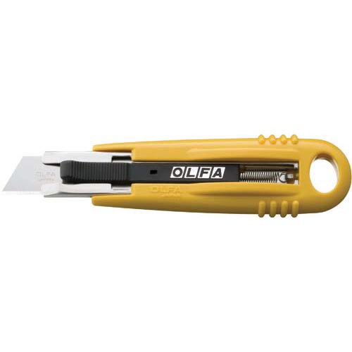 スプリングで刃が自動的に戻る、安心設計の開梱用カッター。別売りのフックS刃、オールメタルセーフティカッター替刃も装着可能です。刃は前後使えます。