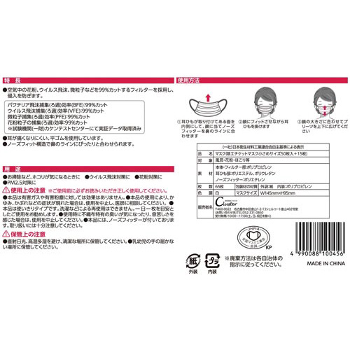 ●材質/本体:ポリプロピレン、耳ひも:ポリエステル・ポリウレタン、ノーズフィッター:ポリエチレン