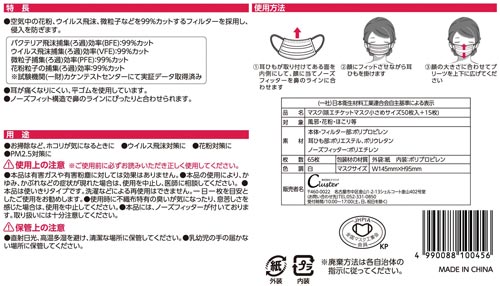 ●材質/本体:ポリプロピレン、耳ひも:ポリエステル・ポリウレタン、ノーズフィッター:ポリエチレン