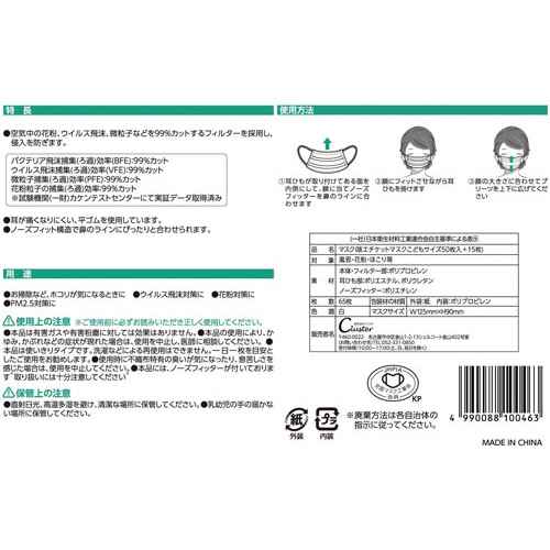 ●材質/本体:ポリプロピレン、耳ひも:ポリエステル・ポリウレタン、ノーズフィッター:ポリエチレン