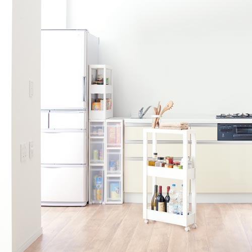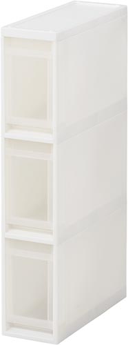 幅17cmのスリムタイプ。スタイリッシュなホワイトカラーで、キッチンや洗面所などあらゆるシーンでのストック収納におすすめです。