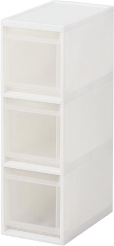 幅27cmのワイドタイプ。スタイリッシュなホワイトカラーで、キッチンや洗面所などあらゆるシーンでのストック収納におすすめです。
