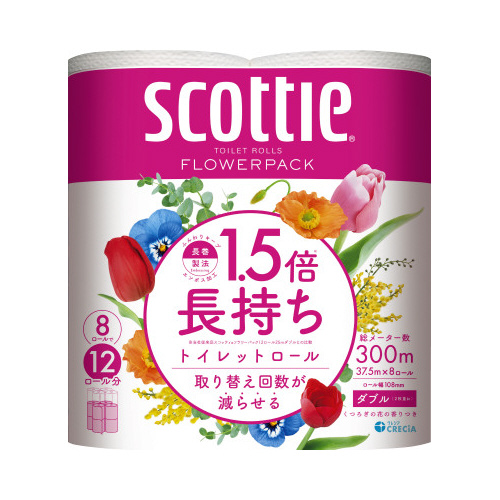 8ロールで12ロール分の長さの長尺トイレットロール!たっぷり使えて取替えの手間を軽減し、省スペース化で保管もスッキリ。くつろぐ花の香りつき。