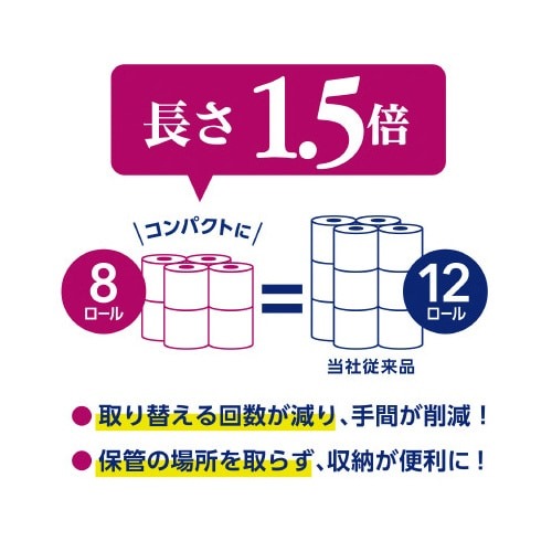 8ロールで12ロール分の長さの長尺トイレットロール!たっぷり使えて取替えの手間を軽減し、省スペース化で保管もスッキリ。くつろぐ花の香りつき。