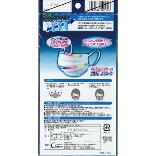 ●材質/本体:ポリプロピレン、メガネ曇り抑制フィルター:ポリプロピレン・ポリエチレン、ノーズフィッター・くちもとワイヤー:ポリエチレン