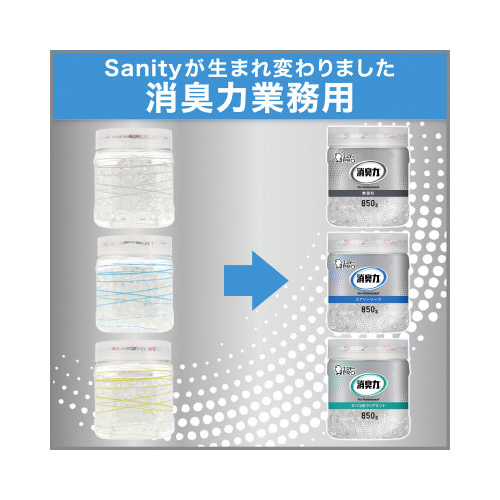 Sanityは消臭力に生まれ変わりました。薬液をたっぷり吸い込んだビーズが、悪臭をぐんぐん吸い込み、幅広いニオイを強力に消臭する業務用消臭剤です。