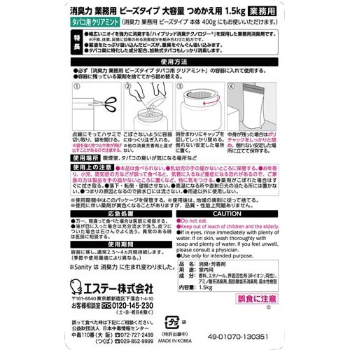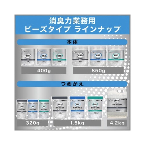 Sanityは消臭力に生まれ変わりました。薬液をたっぷり吸い込んだビーズが、悪臭をぐんぐん吸い込み、幅広いニオイを強力に消臭する業務用消臭剤です。