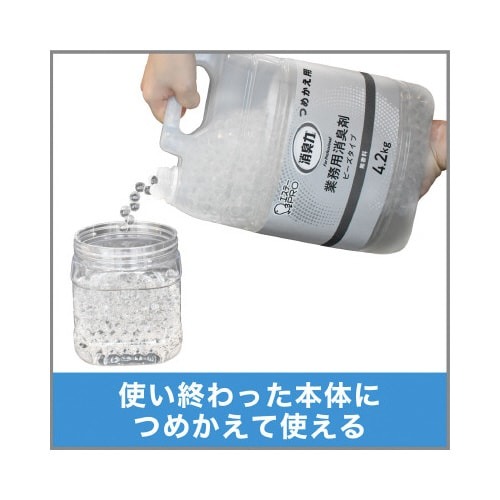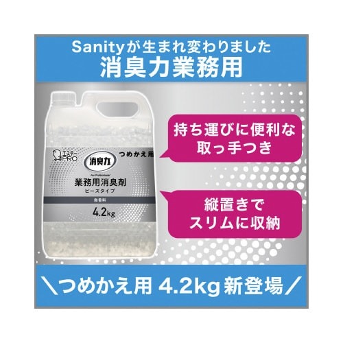 Sanityは消臭力に生まれ変わりました。薬液をたっぷり吸い込んだビーズが、悪臭をぐんぐん吸い込み、幅広いニオイを強力に消臭する業務用消臭剤です。