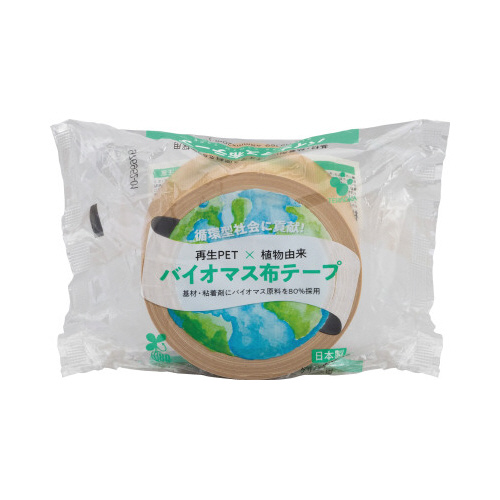 テープの基材と粘着剤に植物由来の材料を80%使用した、環境に配慮した製品。再生PET繊維を横糸に使用しており、グリーン購入法に適合。植物由来材料とリサイクル材料を使用することで、循環型社会に貢献。
